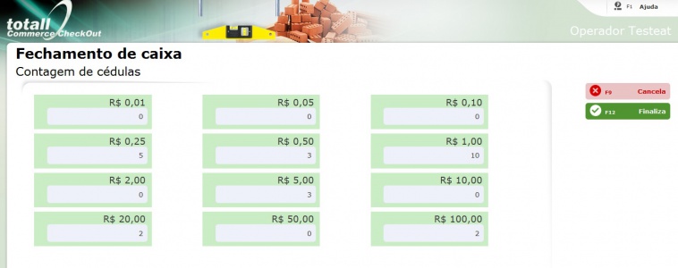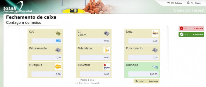 2. Informe a contagem de meios, digite o valor referente a cada meio de pagamento conforme os comprovantes que estão no caixa.