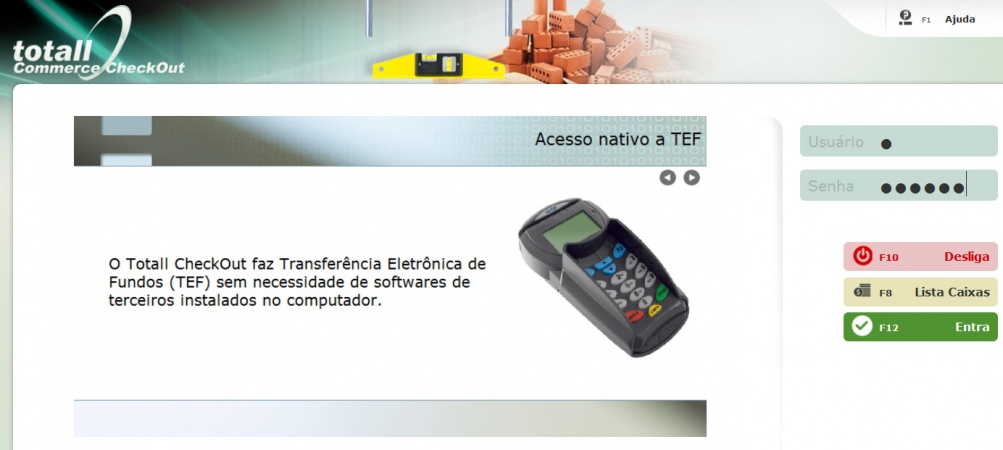 1. Informe seu usuário e senha. Somente o usuário com a permissão PER0178 pode abrir o caixa. Os papéis e permissões são definidos no Totall Backoffice >> Principal >> Usuários >> Cadastro.