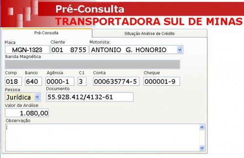 | − | [[Imagem:AnaliseCredito4.JPG| | + | [[Imagem:AnaliseCredito4.JPG|500px|thumb|left|Cadastro de Clientes.]]'''Cadastro de Placas/Motoristas''' |