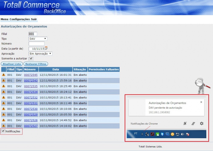 Ao logar no sistema e enquanto estiver logado, você receberá uma notificação escrita e/ou sonora informando que há um DAV/Pré-venda para autorizar. Essa notificação será apresentada somente se a opção Notificação estiver setada e surgirá no rodapé do seu monitor. A caixa de notificação poderá ser minimizada ou fechada, o exemplo na imagem abaixo é do navegador de internet Google Chrome.