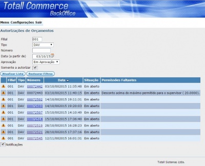 DAV/Pré-vendaAo efetuar um DAV/Pré-venda através do Totall Order quando for solicitada a autorização remota, o sistema irá gerar uma solicitação no Totall Commerce Web. Enquanto o DAV/Pré-venda com pendência não for autorizado remotamente o mesmo constará como pendente. Para isso acesse DAV/Pré-venda >> Autorizações.